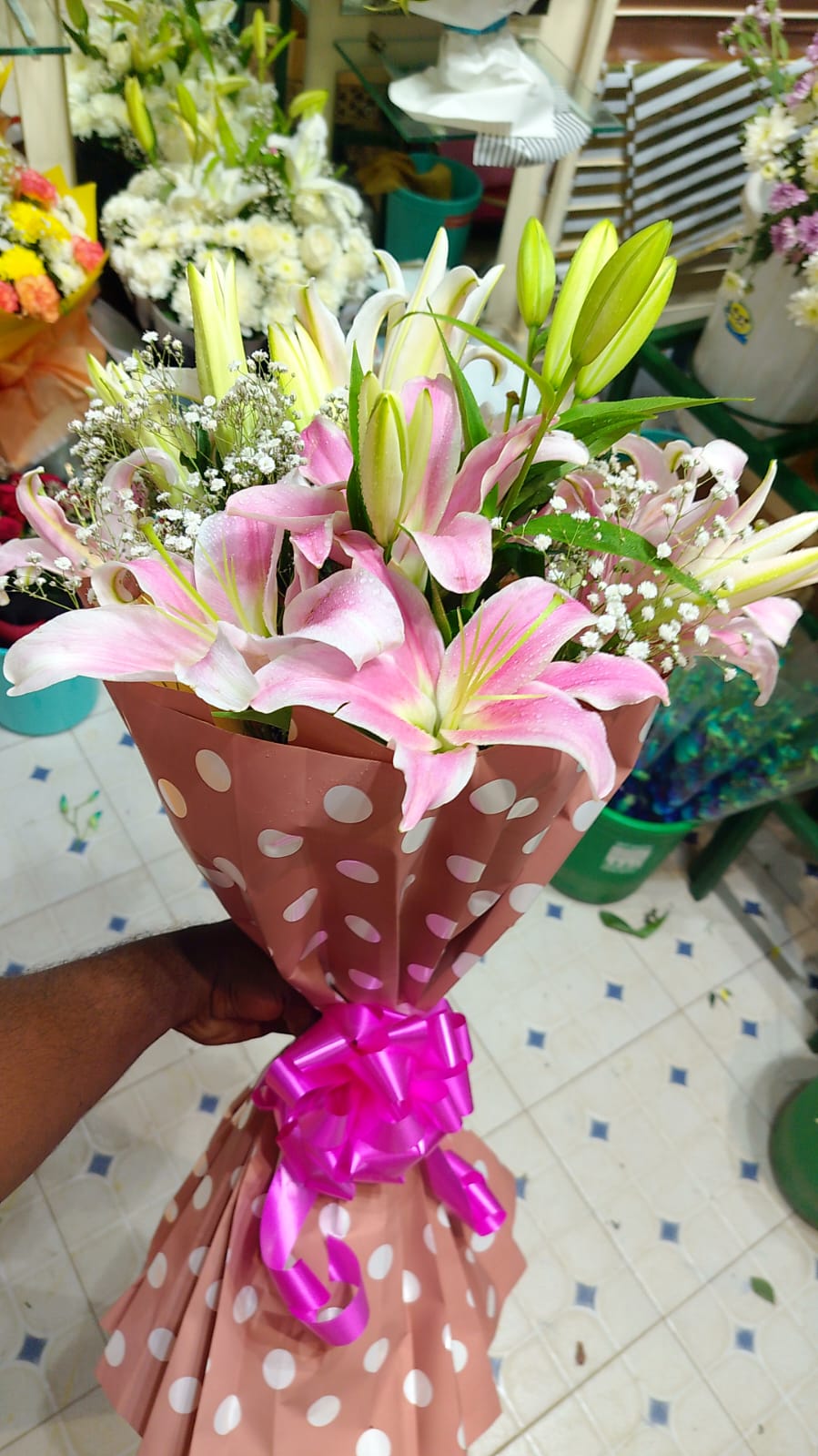 A stunning bunch of Lily to wow the special someone. Beautifully wrapped in delicate non-woven paper and tied with ribbon, this designer bouquet is sure to bring a smile on your loved ones face. Product Details: